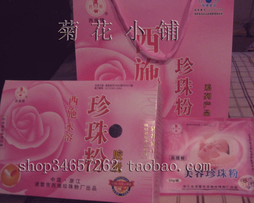 本店价:35元+5元=40元 四套起包邮。欢迎批发,如需要可为药店或化妆品店提供厂家三证。 因为已经是成本价卖了,所以数量不到的邮费自理哦~~ 本店所售的粉粉均为西施珍珠粉厂直接进的正品,免去中间环节,保证质量。 **产品说明: 此组合为西施水溶珍珠粉胶囊一盒+西施珍珠面膜专用粉一包[规 格] 珍珠面膜粉50g 水溶珍珠粉胶囊0.3g×30粒×4瓶 [制 造 商] 浙江省诸暨市西施珍珠粉厂 [地 址] 浙江省诸暨市山下湖珍珠特色工业区 [生 产 日期] 08年最新